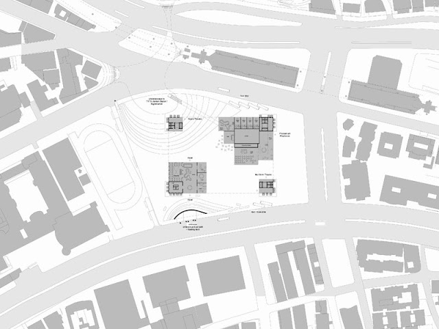 Balconies and terraces with different programs activate the space. Sometimes they are open and public; sometimes exclusive or intimate. Ticketable, VIP or Free. Swimming pool, skate area, public green, play ground, hotel garden, breakfast café, hopefully attracting many different target groups. The audience can take center stage.